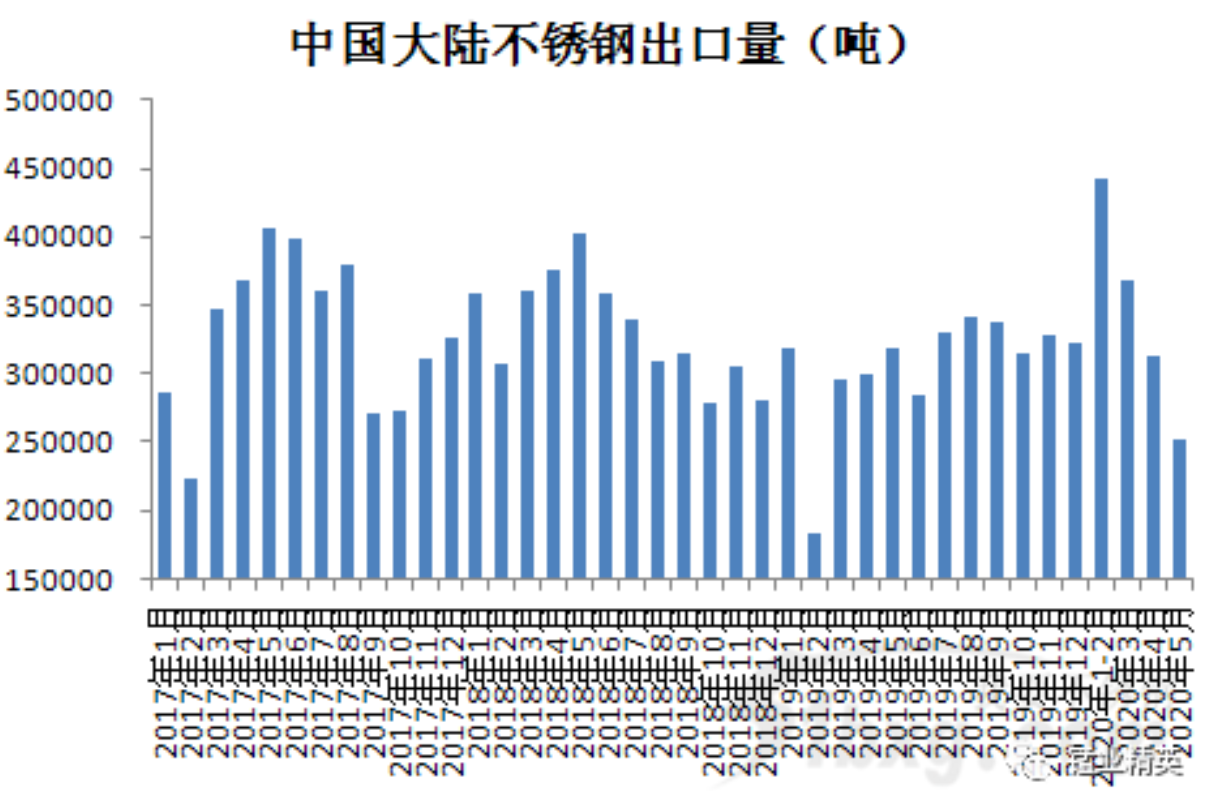 因國外疫情影響,各國港口封鎖,運輸受阻,導致5月國內出口大幅下降。據悉海外訂單一般都是提前1-2個月簽訂,所以業內預估6月不銹鋼出口量將繼續下降。