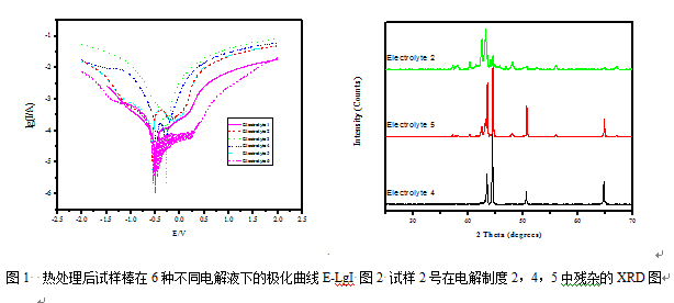 不銹鋼中含有較高的Cr、Ni, 溶液中很容易鈍化, 而且鋼中含有的碳化物及金屬間化合物大都比較穩(wěn)定, 所以電解液的酸度應該比較大, 活性離子含量也應較高, 在水溶液中進行電解是比較困難的,如果用醇做溶劑, 對基體活化溶解的效果更好,同時可以抑制一些相的水副反應的發(fā)生,并使電解后的表面光滑,從而減少損失,便于洗滌。試驗首先考查了試樣棒2號在六種不同電解制度下(電解液不同,但均以醇為溶劑)的極化曲線(圖1)。即利用析出相與基體在電解液中穩(wěn)定電位的差別,外加電流使試樣極化,當極化條件合適(即電極電位介于基體的穩(wěn)定電位與析出相穩(wěn)定電位之間),合金基體以一定的速度電解,目的相則以不溶性殘渣的形式被提取出來。圖1顯示腐蝕電流從大到小分別為電解制度4-5-2-6-1-3。因此,電解制度6,1,3的電解速度相對要慢。電解效果也證明了2205雙相不銹鋼在電解制度2,4,5中的電解效果比較好。而電解制度3和6的均出現(xiàn)明顯的點蝕現(xiàn)象。